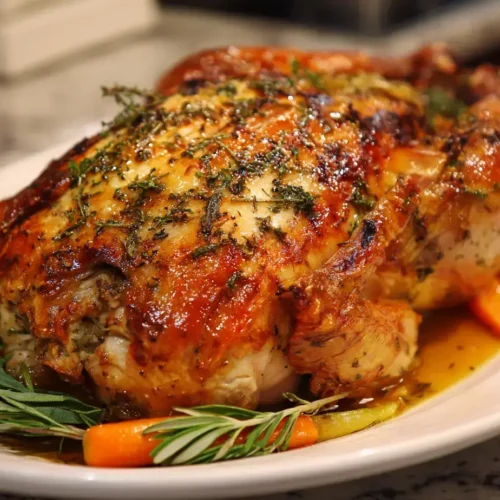 - After resting, carve the turkey according to your preference. Separate the drumsticks and thighs, then slice the breast meat. Arrange the carved turkey on a large serving platter and serve immediately with your favorite Thanksgiving sides.